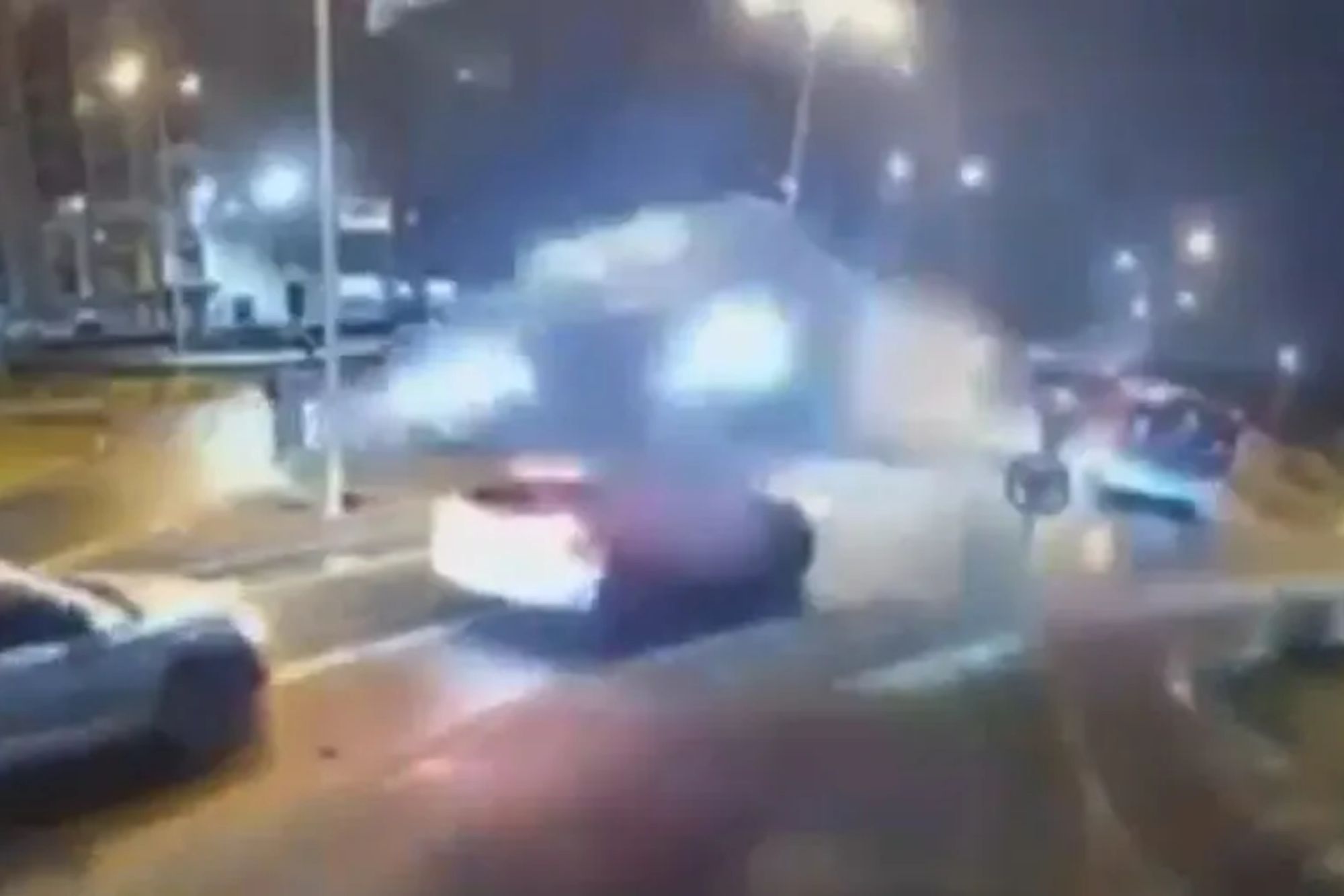 Las impactantes imágenes de CCTV muestran al automóvil acelerando en línea recta en una rotonda, chocando contra la acera y siendo lanzado por los cielos a la velocidad del rayo.
