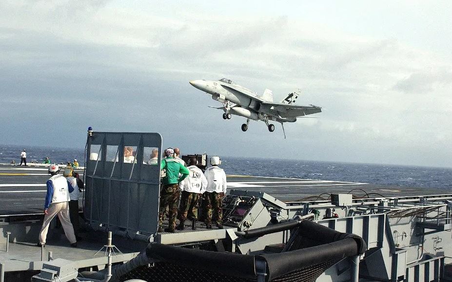 Un avión de combate despegando de la cubierta de un portaaviones.