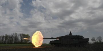El equipo de tanques ucraniano disparando un tanque de leopardo 2a4.