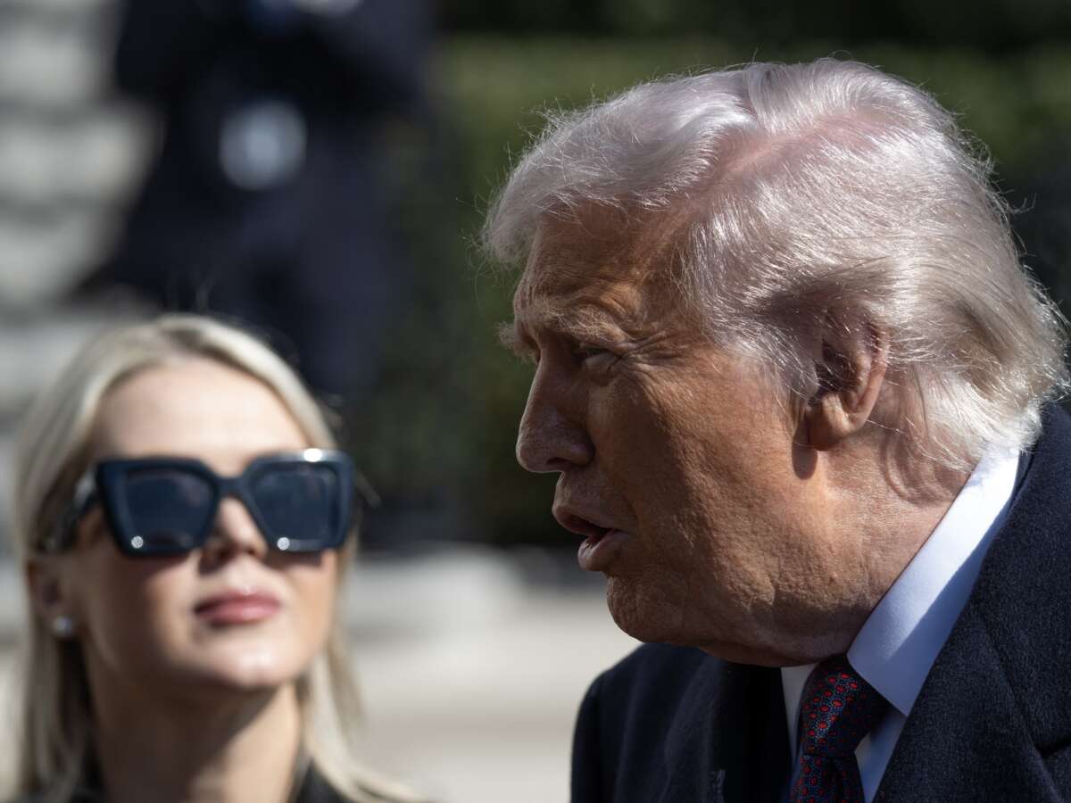 White House Press Secretary Karoline Leavitt looks on as President Donald Trump speaks to the press on February 27, 2026.