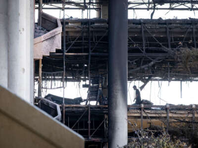 Un hombre de seguridad no identificado camina por el piso en la sede de la Red de Noticias de la República Islámica de Irán (Irinn) en el complejo de televisión estatal de Irán, que fue destruido en huelgas israelíes, en el norte de Teherán, Irán, el 19 de junio de 2025.