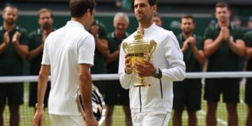 Djokovic tiene siete títulos de Wimbledon (2011, 2014, 2015, 2018, 2019, 2021, 2022) y ha sido subcampeón en 2023 y 2024 a Carlos Alcaraz. Si gana este año, atará el récord de Roger Federer de ocho títulos de singles masculinos de Wimbledon.