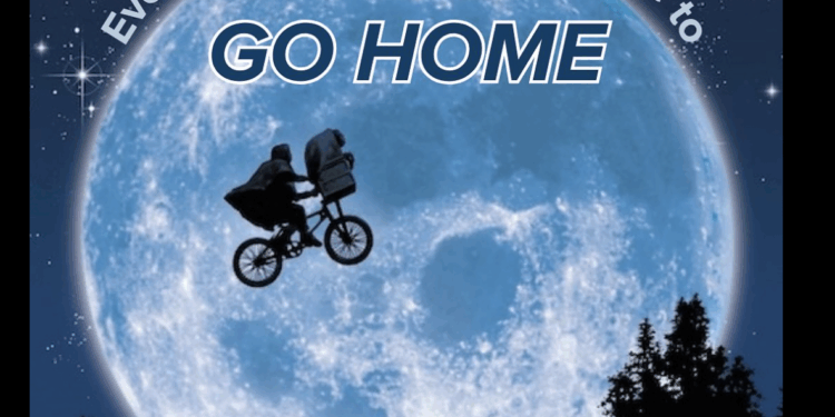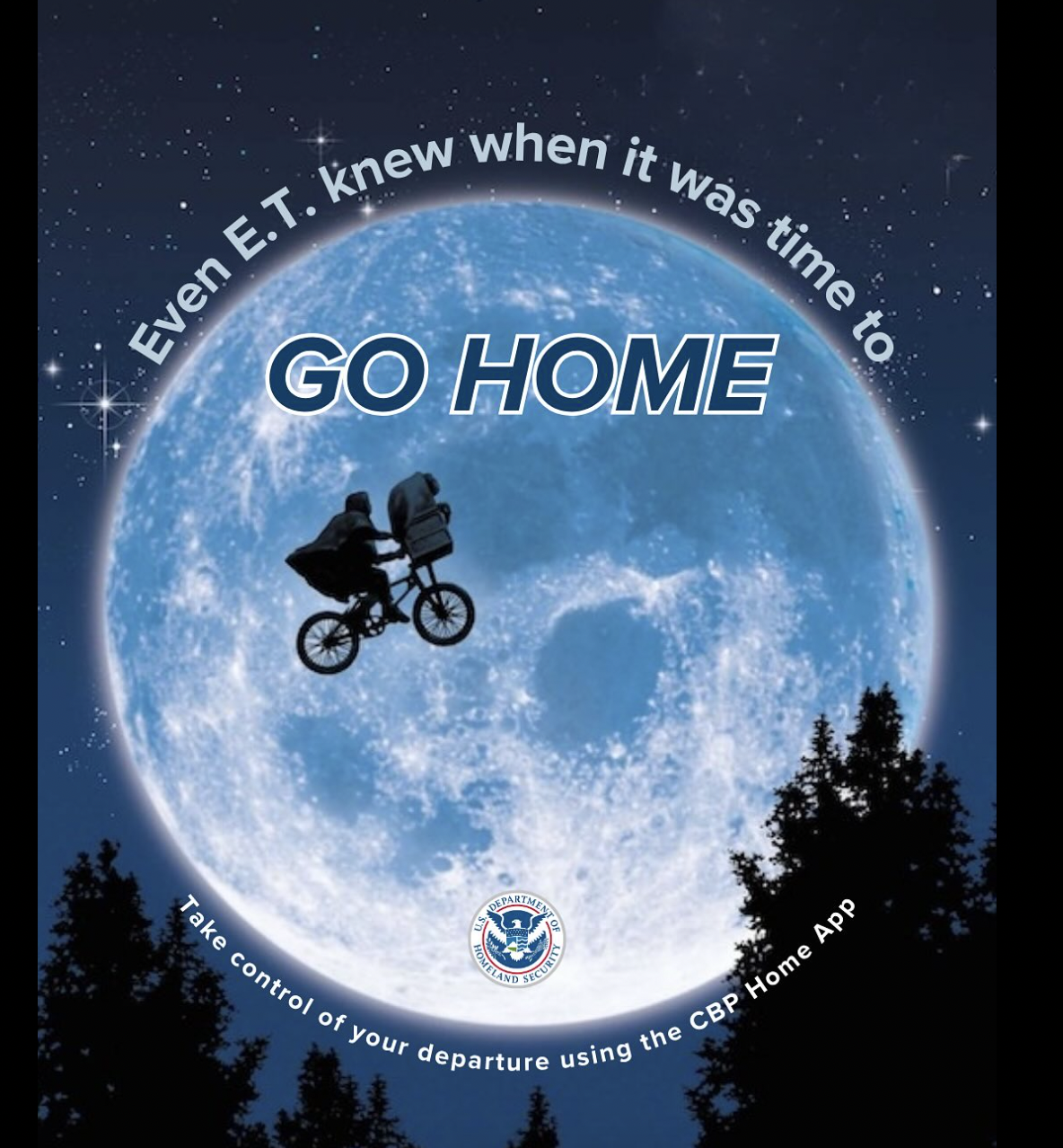 «Incluso ET sabía cuándo era hora de irse a casa», dice la versión editada del DHS del póster de la película, debajo de una imagen de ET y Elliot, los protagonistas de la película de ciencia ficción, montando una bicicleta a través del cielo nocturno. «Tome el control de su partida utilizando el CBP [Customs and Border Protection] aplicación «.