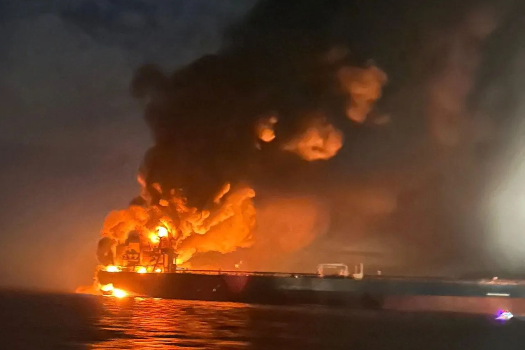 Llamas y humo espeso se elevan desde un petrolero después de que las explosiones sacudieran a dos buques de la flota en la sombra de Rusia en el Mar Negro.Crédito: Reuters