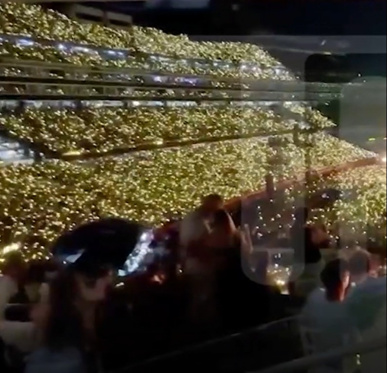 En el nuevo video, lanzado por TMZ, el dúo se ve abrazando y balanceándose a la música mientras la multitud ilumina el estadio con sus teléfonos.