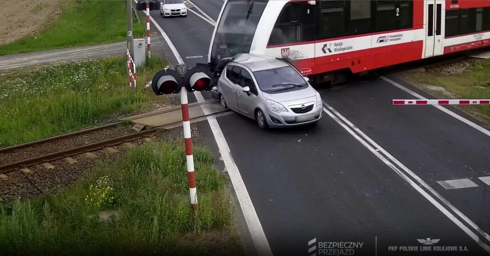 Las imágenes de CCTV muestran que las barreras bajan automáticamente para bloquear el tráfico desde un tren que se aproxima a lo largo de la ruta Granowo-Steeszew en Polonia.