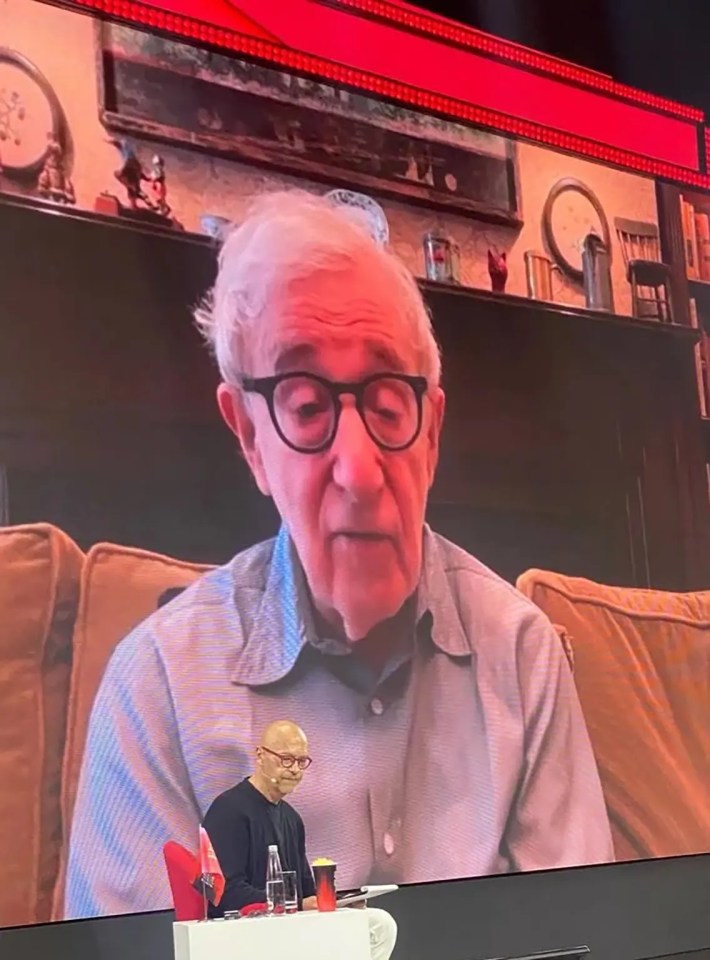 Woody Allen hablando en una gran pantalla en un festival de cine.