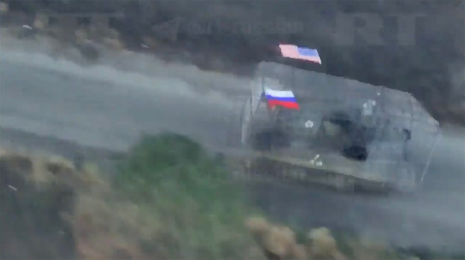 Este es el momento en que los soldados rusos retorcidos se burlan de Ucrania volando una bandera estadounidense a la batalla.
