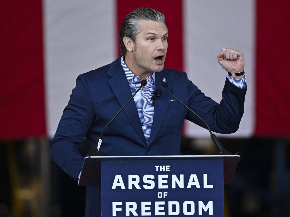 U.S. Defense Secretary Pete Hegseth speaks at Blue Origin in Cape Canaveral, Florida, on February 2, 2026.
