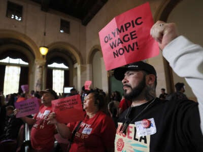 Los residentes de Los Ángeles tienen letreros leyendo "Salario olímpico ahora" Durante un rally interior