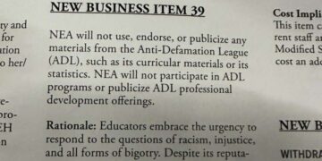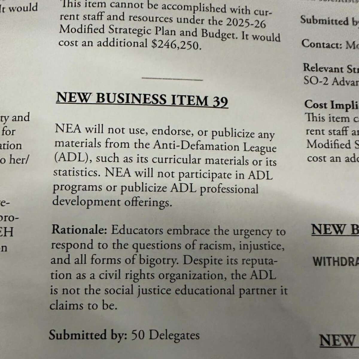 En un voto trascendental, el cuerpo de formulación de políticas de 7,000 miembros de la Asociación Nacional de Educación redujo todos los lazos con la Liga Anti-Defamación. El 6 de julio, la Asamblea Representante Nacional de la NEA aprobó el nuevo artículo de negocios 39, cometiendo que la NEA «no usará, respalde ni publicitará materiales de la Liga Anti-Defamación (ADL), como sus materiales o estadísticas curriculares». El razonamiento: «A pesar de su reputación como organización de derechos civiles, la ADL no es el socio educativo de la justicia social que dice ser».