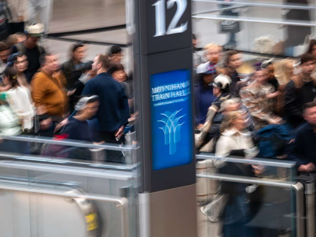 People move through the Moynihan Train Hall in Manhattan on November 26, 2025, in New York City.