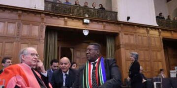 El embajador sudafricano en los Países Bajos Vusimuzi Madonsela y los miembros de la delegación se encuentran en la sala del tribunal de la Corte Internacional de Justicia (ICI) en La Haya, Países Bajos, el 24 de mayo de 2024.