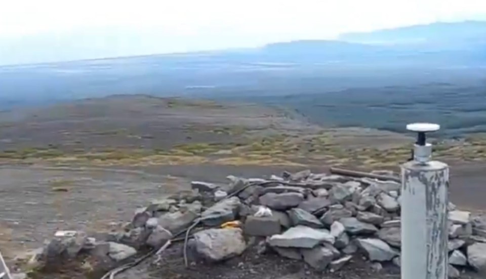 Equipo de monitoreo sísmico en una ladera rocosa con vistas a un vasto paisaje plano.