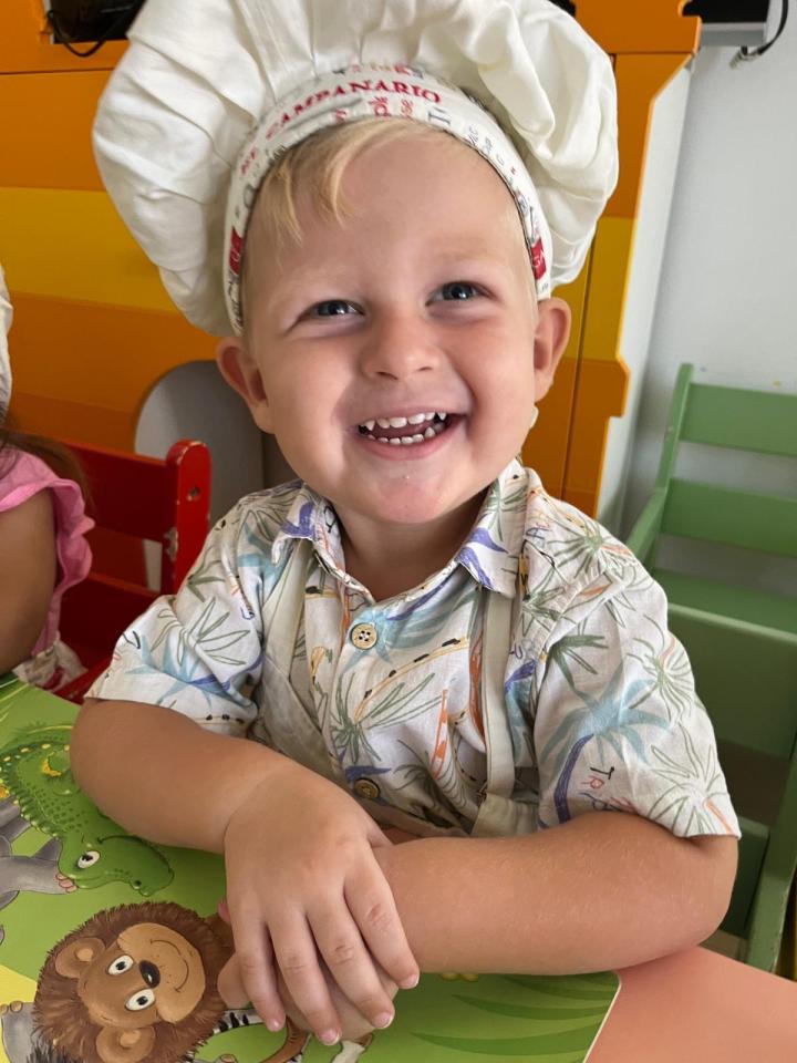 Extrañando el niño británico Oliver Pugh con un sombrero de chef y una camisa estampada, sonriendo.