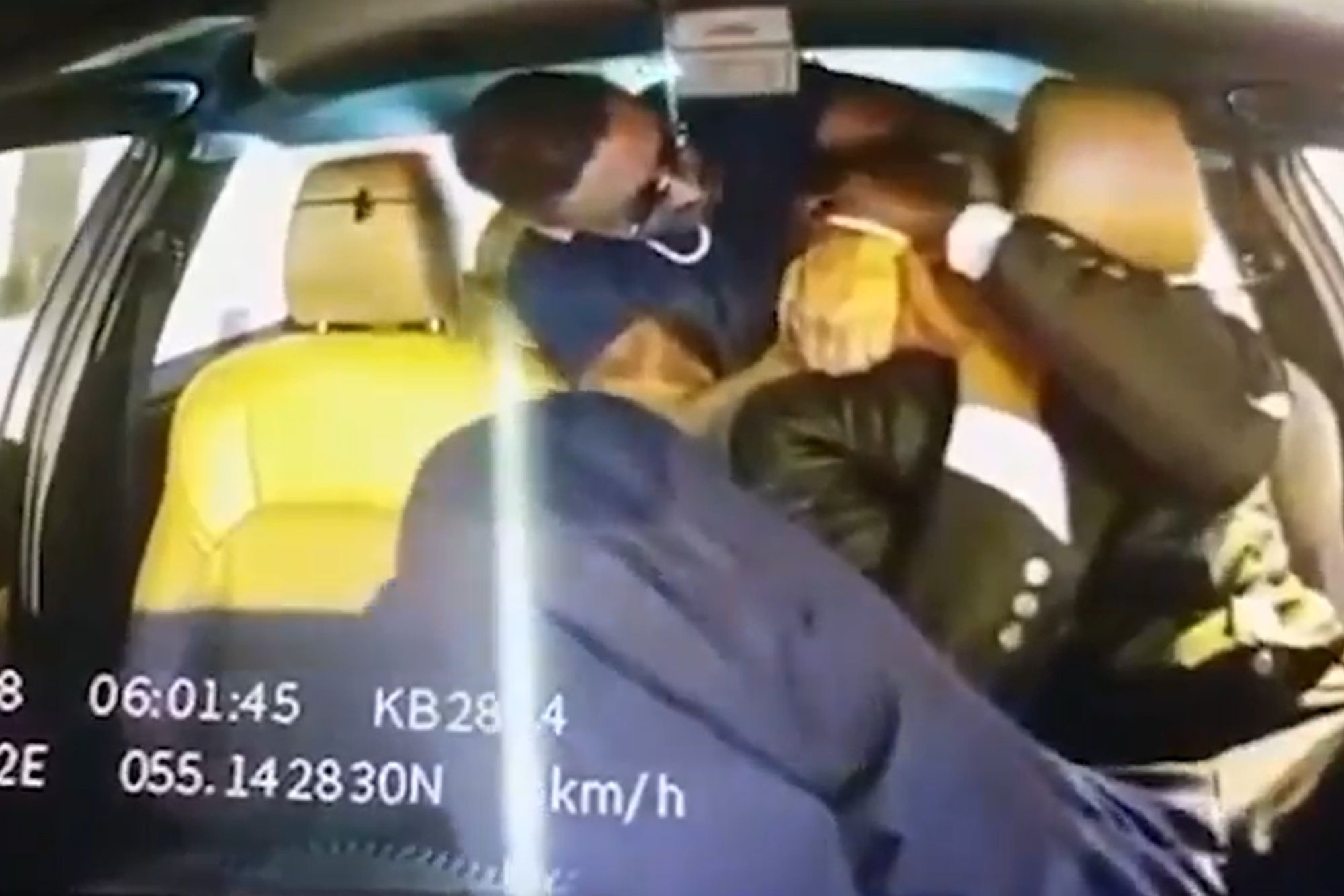 El pasajero, cuyo nombre no ha sido identificado, pasa del asiento trasero al espacio directamente detrás del conductor, que se dice que es de Kenia.