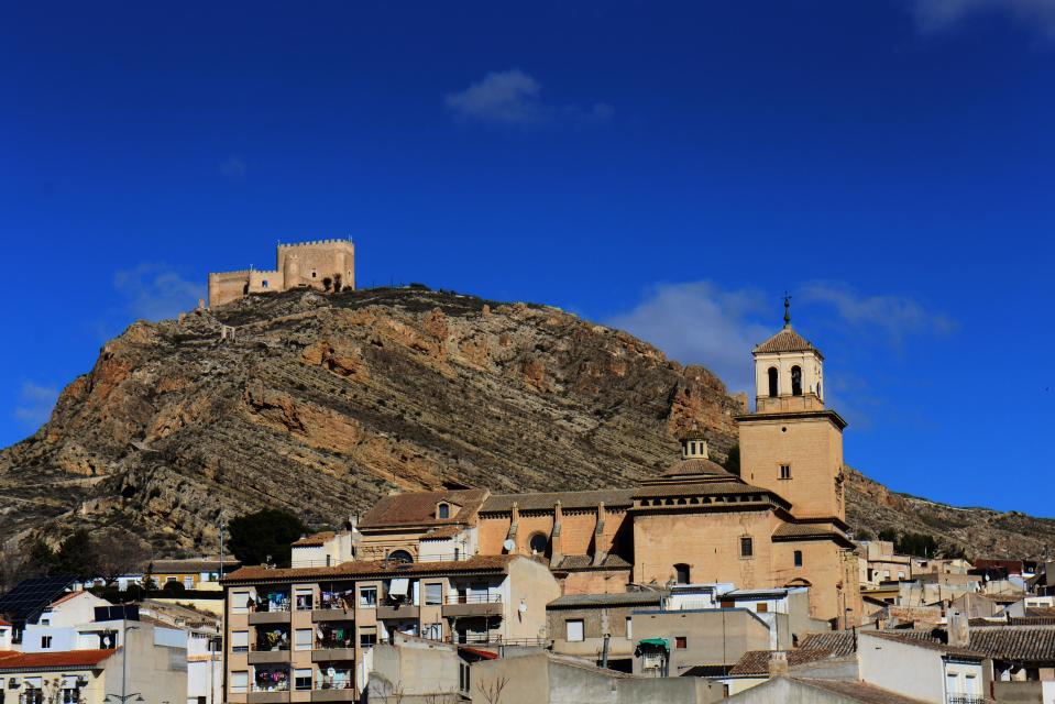 Castillo de Jumilla Castle sobre una colina con vistas a una ciudad.