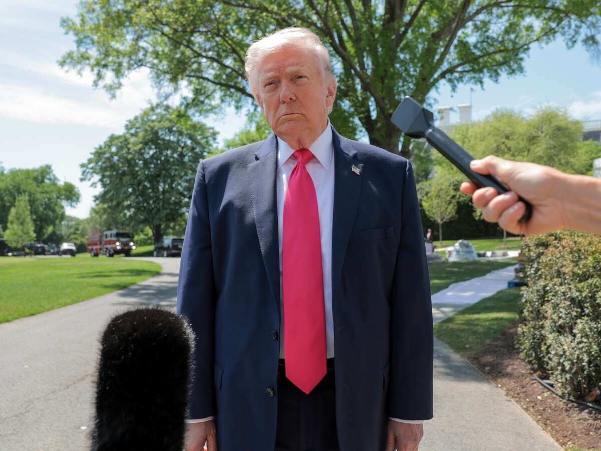 President Donald Trump speaks to the press on the South Lawn of the White House on April 16, 2026.