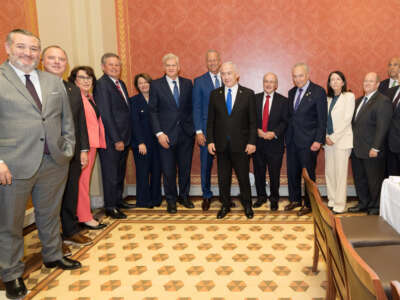 Los senadores participan en una fotografía con el primer ministro israelí Benjamin Netanyahu.