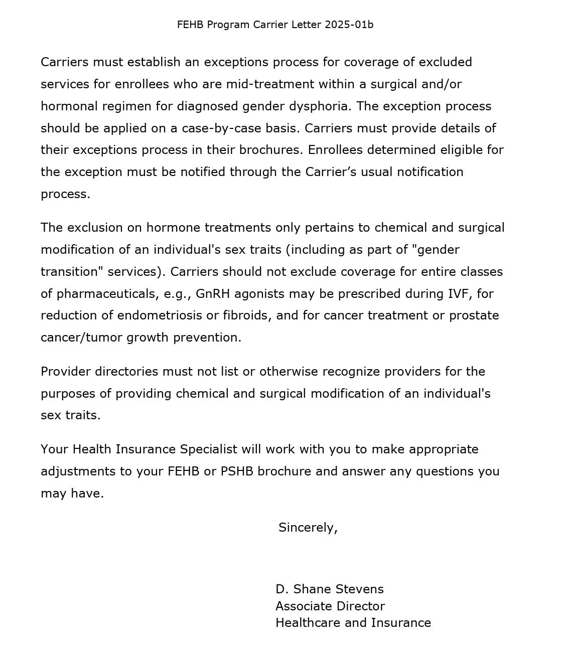 «Para el año del plan 2026, la modificación química y quirúrgica de los rasgos sexuales de un individuo a través de intervenciones médicas (incluir servicios de» transición de género «) ya no estará cubierta por los programas FEHB o PSHB. Esta exclusión se expande a la carta de transporte 2025-01A y se aplica a la falta de edad. Como una excepción de una excepción, los servicios de asesoramiento de género posibles o diagnosticados para la disforra de género que aún debe ser cubierta. proveedor y pueden incluir a aquellos que brindan asesoramiento basado en la fe ”, dice el memorando.