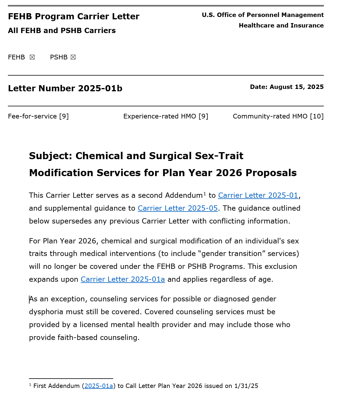 «Para el año del plan 2026, la modificación química y quirúrgica de los rasgos sexuales de un individuo a través de intervenciones médicas (incluir servicios de» transición de género «) ya no estará cubierta por los programas FEHB o PSHB. Esta exclusión se expande a la carta de transporte 2025-01A y se aplica a la falta de edad. Como una excepción de una excepción, los servicios de asesoramiento de género posibles o diagnosticados para la disforra de género que aún debe ser cubierta. proveedor y pueden incluir a aquellos que brindan asesoramiento basado en la fe ”, dice el memorando.