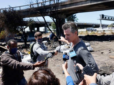 El gobernador de California, Gavin Newsom (D), insta a las ciudades y condados a adoptar una ordenanza modelo recientemente lanzada destinada a prohibir y despejar los campamentos de personas sin hogar.
