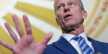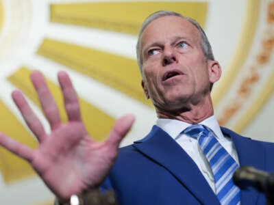 El líder de la mayoría del Senado, John Thune, habla con los periodistas después del almuerzo de política republicana semanal en el edificio del Capitolio de los Estados Unidos el 10 de junio de 2025 en Washington, DC