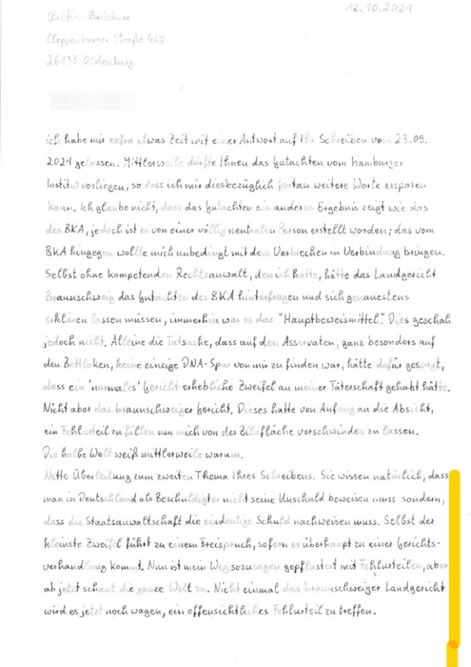 Brueckner incluso afirma que el caso en su contra se basa en «testigos comprados» y revela su conciencia de su notoriedad global.