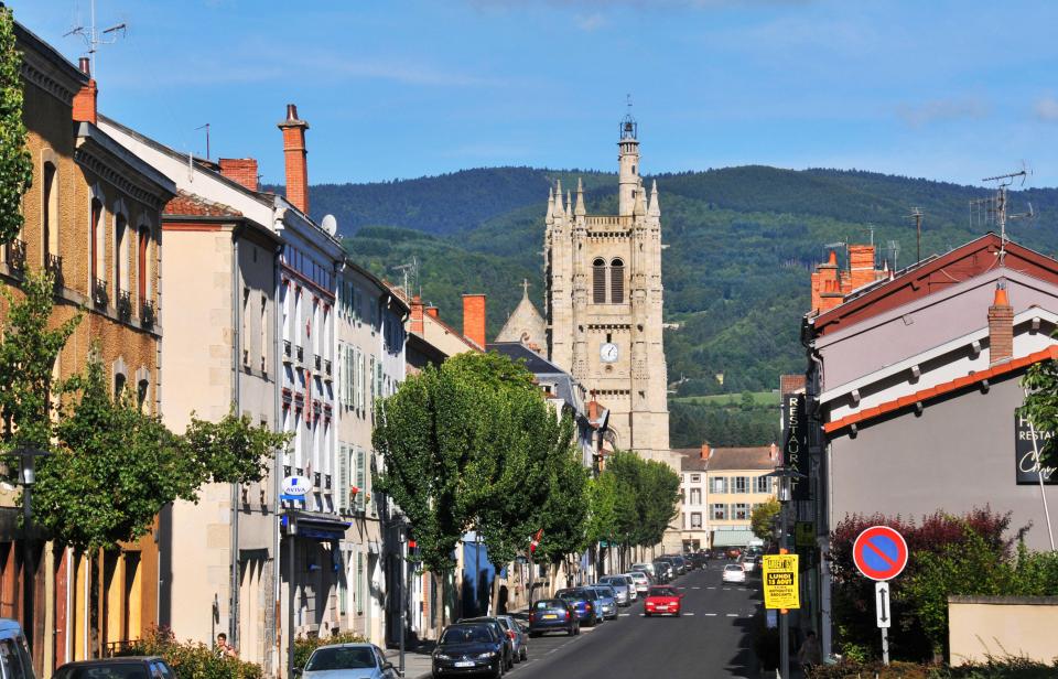 Escena callejera en Ambert, Francia, que muestra edificios, autos y una torre de la iglesia en el fondo.