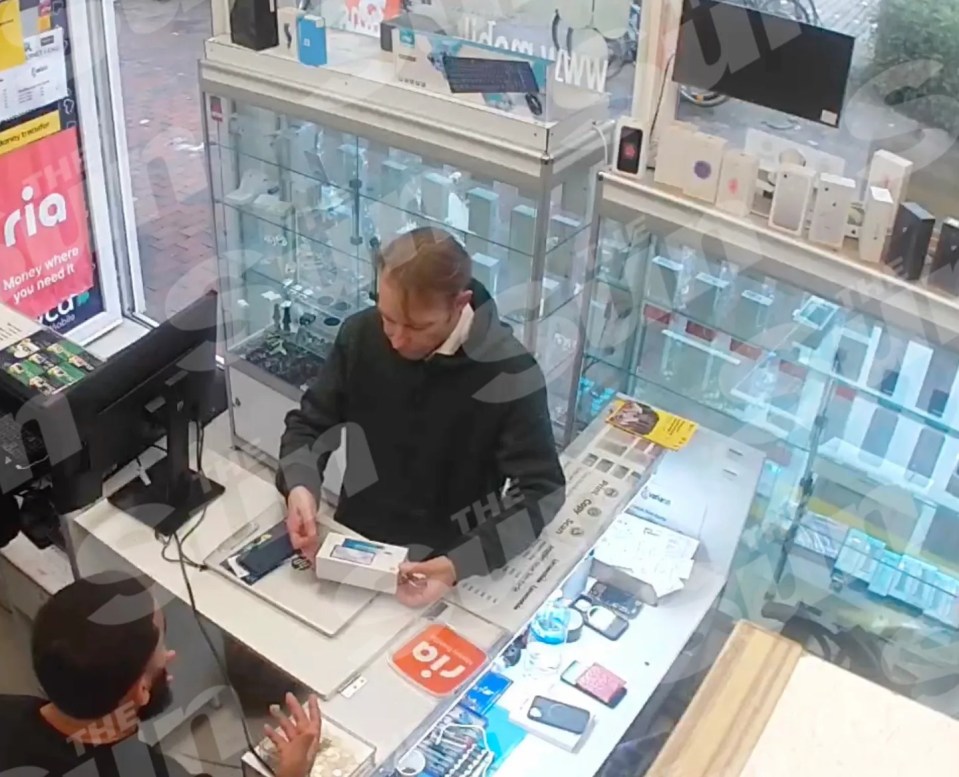 Las imágenes de CCTV muestran a un hombre con una sudadera con capucha negra que compraba un teléfono en un mostrador en una tienda.