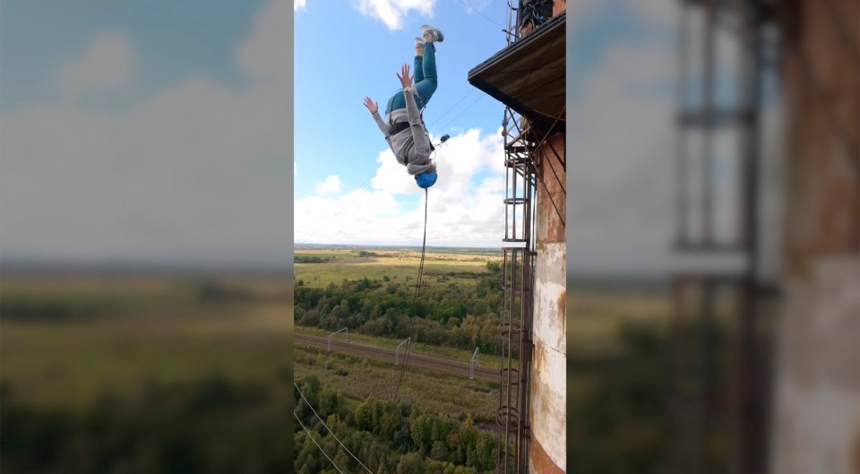 El metraje la muestra balanceo Desde una «cuerda elástica» justo sobre el suelo, después de lo cual se quedó sin herir.