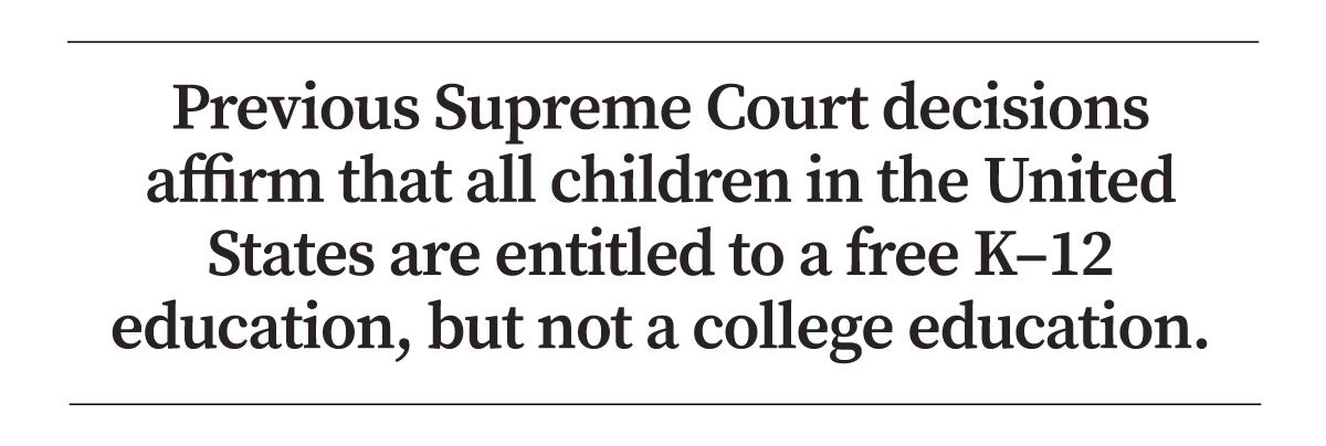 Las decisiones anteriores de la Corte Suprema afirman que todos los niños en los Estados Unidos tienen derecho a una educación gratuita de K – 12, pero no a una educación universitaria. Además, los contribuyentes en el estado subsidian aproximadamente dos tercios de los costos de matrícula de un estudiante, y la mayoría de las escuelas tienen un número limitado de espacios, dijo Mehlman.