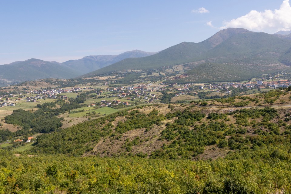 La ciudad de Golaj en el norte de Albania, con villas construidas y rodeadas de montañas y árboles.
