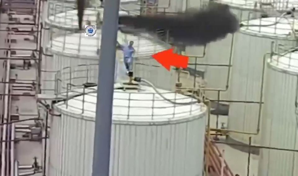 El empleado luego logra llegar a un tanque vecino cuando el camino detrás de él está envuelto por llamas.