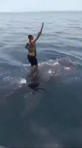 Este es el momento aterrador que un beleeker surfeó y bailó descaradamente en la parte posterior de un tiburón, mientras los espectadores lo criticaban por «abusar» y «acosar» a la criatura gigante.