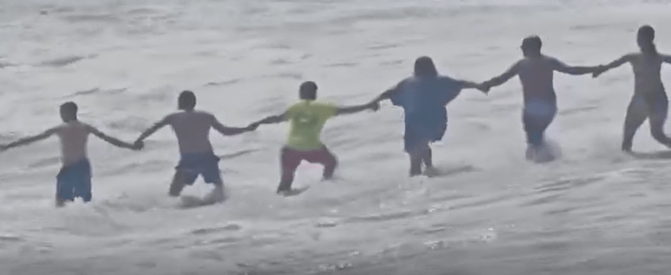 El video de la escena muestra hasta 20 adultos y niños que bloquean los brazos en una dramática cadena humana mientras se derrocaban unos a otros en el surf tratando de recuperar al niño.