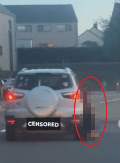 Las imágenes capturadas por otro automovilista, demasiado gráfico para publicar en su totalidad, muestra al perro sin vida atrapado en el lado derecho de un automóvil que conduce a través de Dalhem, este de Bélgica.