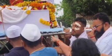 Las imágenes muestran a Vishwash caminando solemnemente en la parte trasera del ataúd con cortes y contusiones visibles, rodeados de otros portadores de fallas.