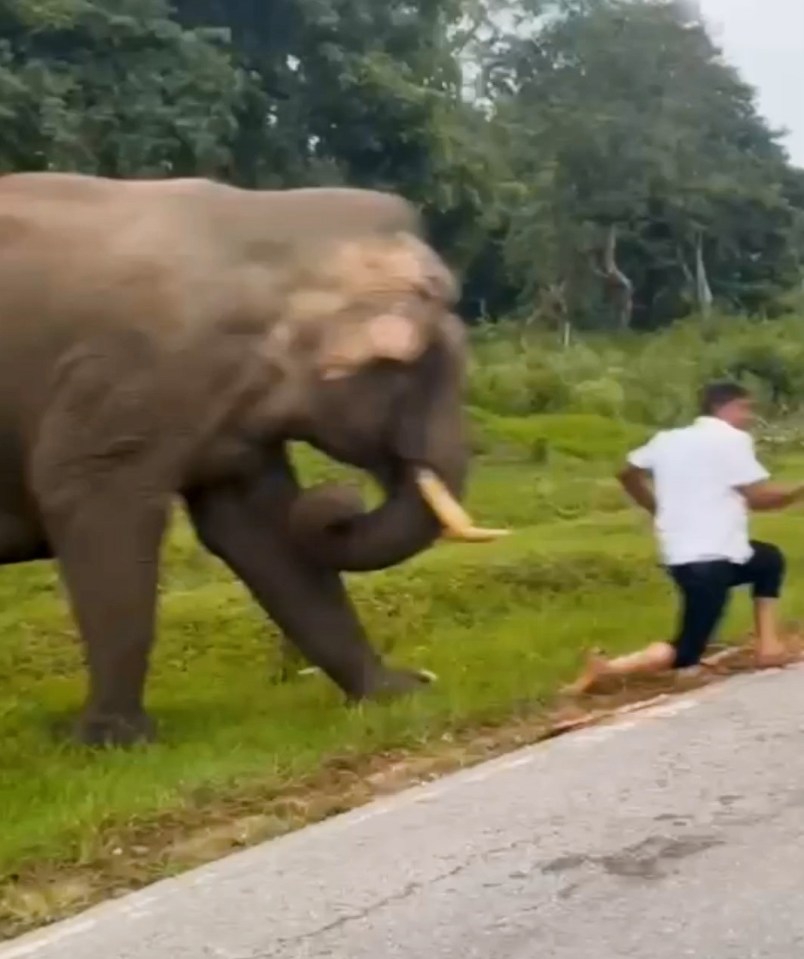 El elefante se cierne sobre el turista y luego se aleja, lo que permite que el hombre se levante del horrible ataque y huya a un lugar seguro.