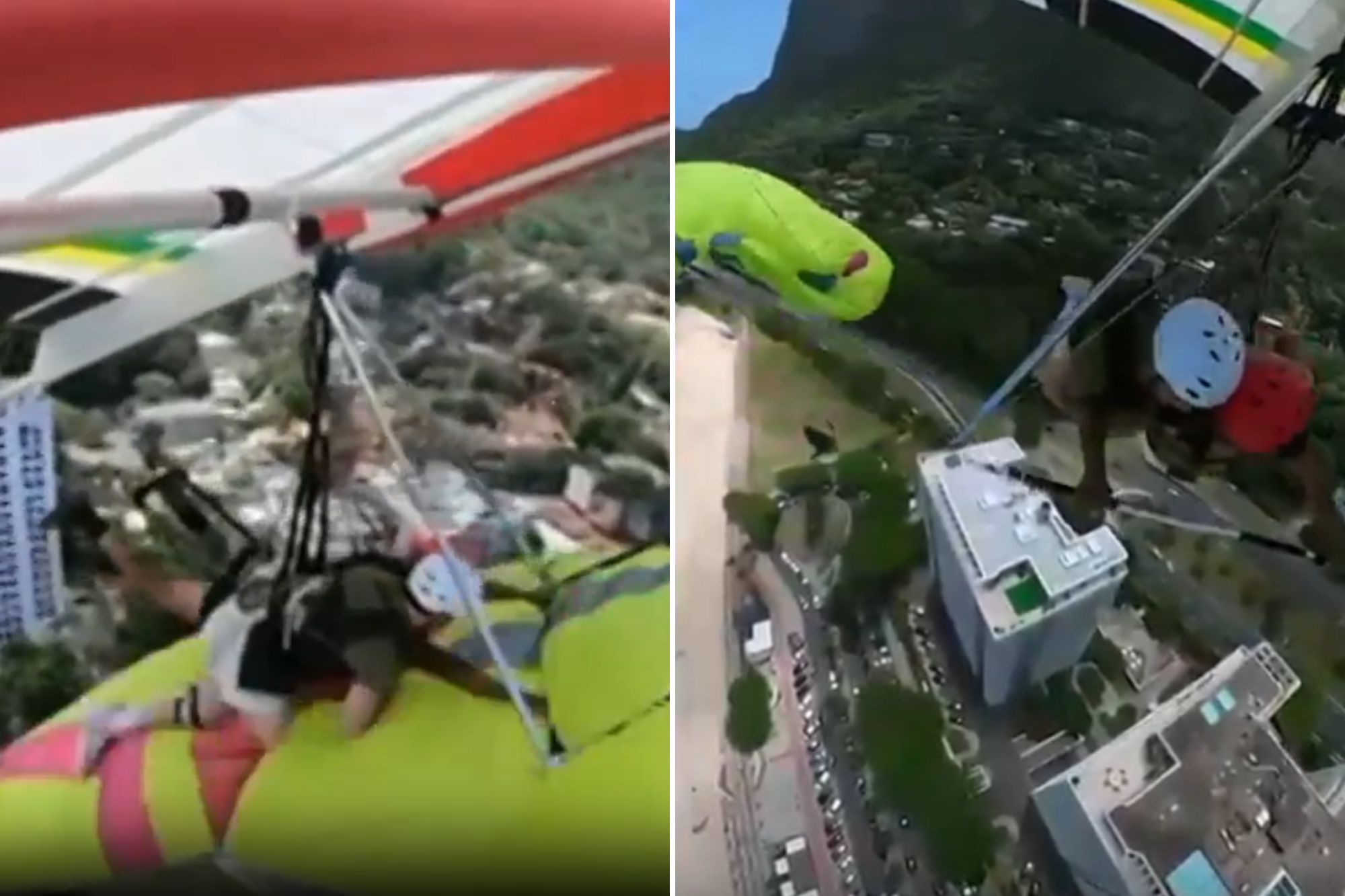 Imágenes de terror muestran a Sergio volando con un estudiante en un ala delta rojo cuando de repente choca con Philip en un parapente verde.