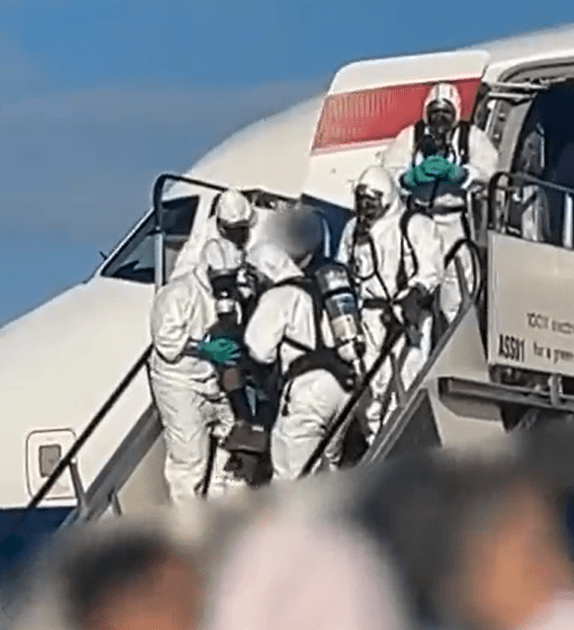 En imágenes apocalípticas, varias personas con trajes blancos de cuerpo completo con equipos de respiración se filmaron en el vuelo, incluso ayudando a un pasajero con un carrito.