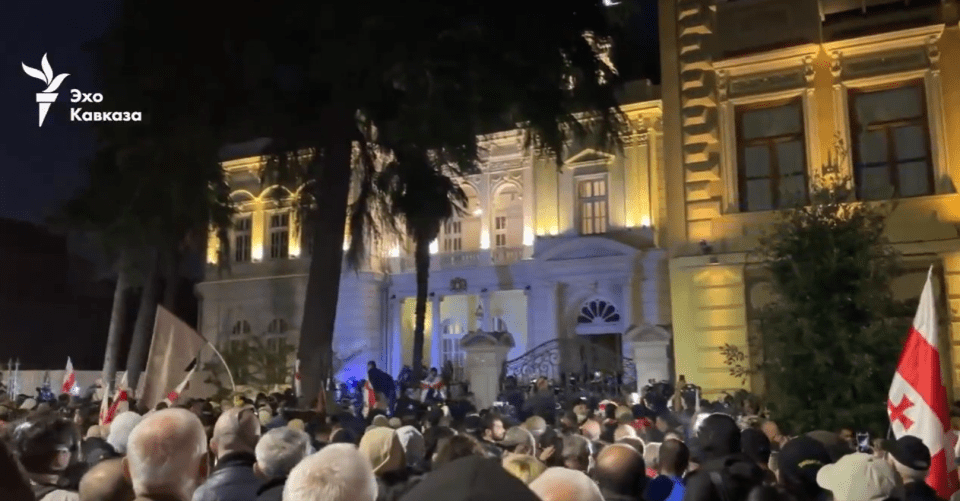 Algunos luego intentaron forzar la entrada al palacio presidencial en el centro de Tbilisi, rompiendo la puerta antes de ser expulsada por la policía antidisturbios.