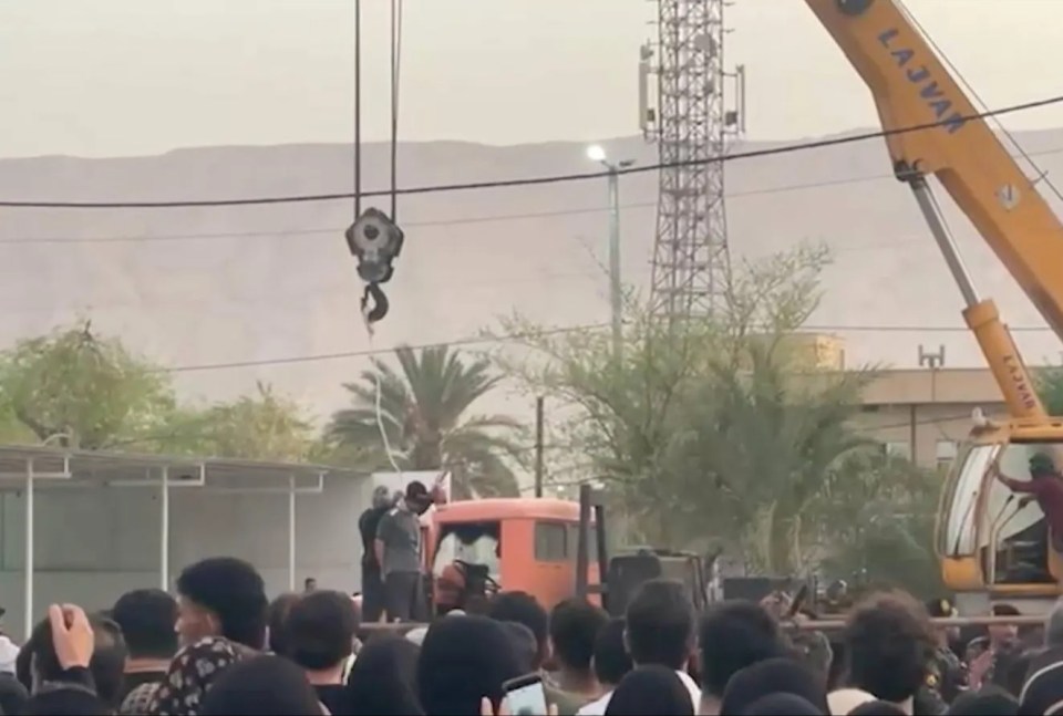 Este es el momento escalofriante que los tiranos de Irán cuelgan un asesino de una grúa frente a una multitud sombría y animada de lugareños y niños.