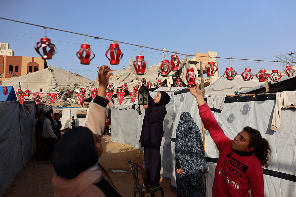 Los signos de resiliencia y esperanza son visibles en la forma en que la gente ha comenzado a decorar sus tiendas de campaña con linternas y medias lunas hechas con cajas de ayuda humanitaria, pintar murales, limpiar las calles de escombros y colocar luces iluminadas. Los mercados tradicionales, como el mercado Al-Zawya, han reabierto y ofrecen una variedad de productos y decoraciones del Ramadán. Las pastelerías han comenzado a preparar una variedad de dulces árabes que a los habitantes de Gaza les encanta disfrutar después del iftar, incluidos qatayef, kunafa (un postre crujiente y mantecoso hecho con masa filo rallada) y awameh (bolas de masa fritas empapadas en almíbar fragante). Las familias planean celebrar iftars comunitarios junto a los escombros de sus casas y están construyendo mezquitas improvisadas para las oraciones del Taraweeh. Los musaharatis caminan por los barrios tocando tambores como forma de dar la bienvenida al Ramadán.
