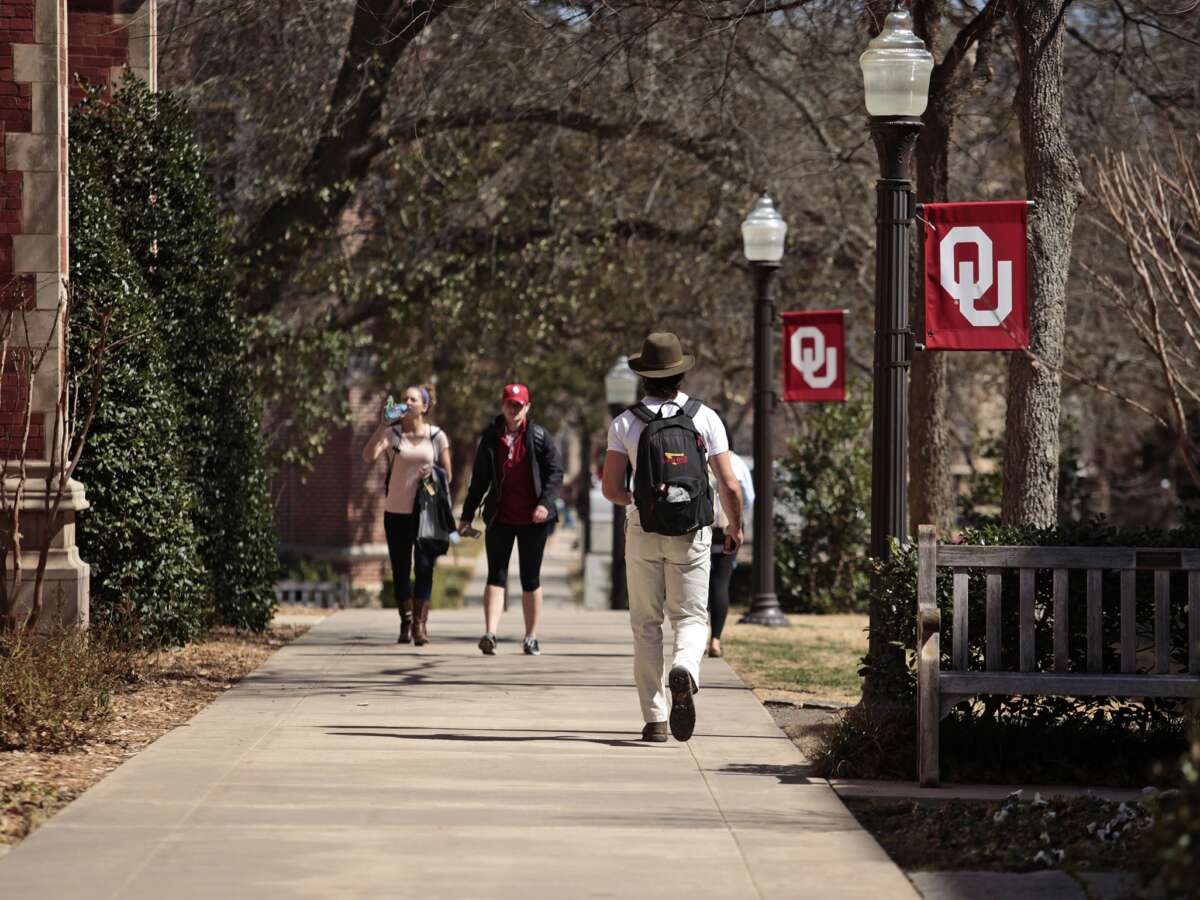 Students walk on campus between classes at the University of Oklahoma on March 11, 2015.