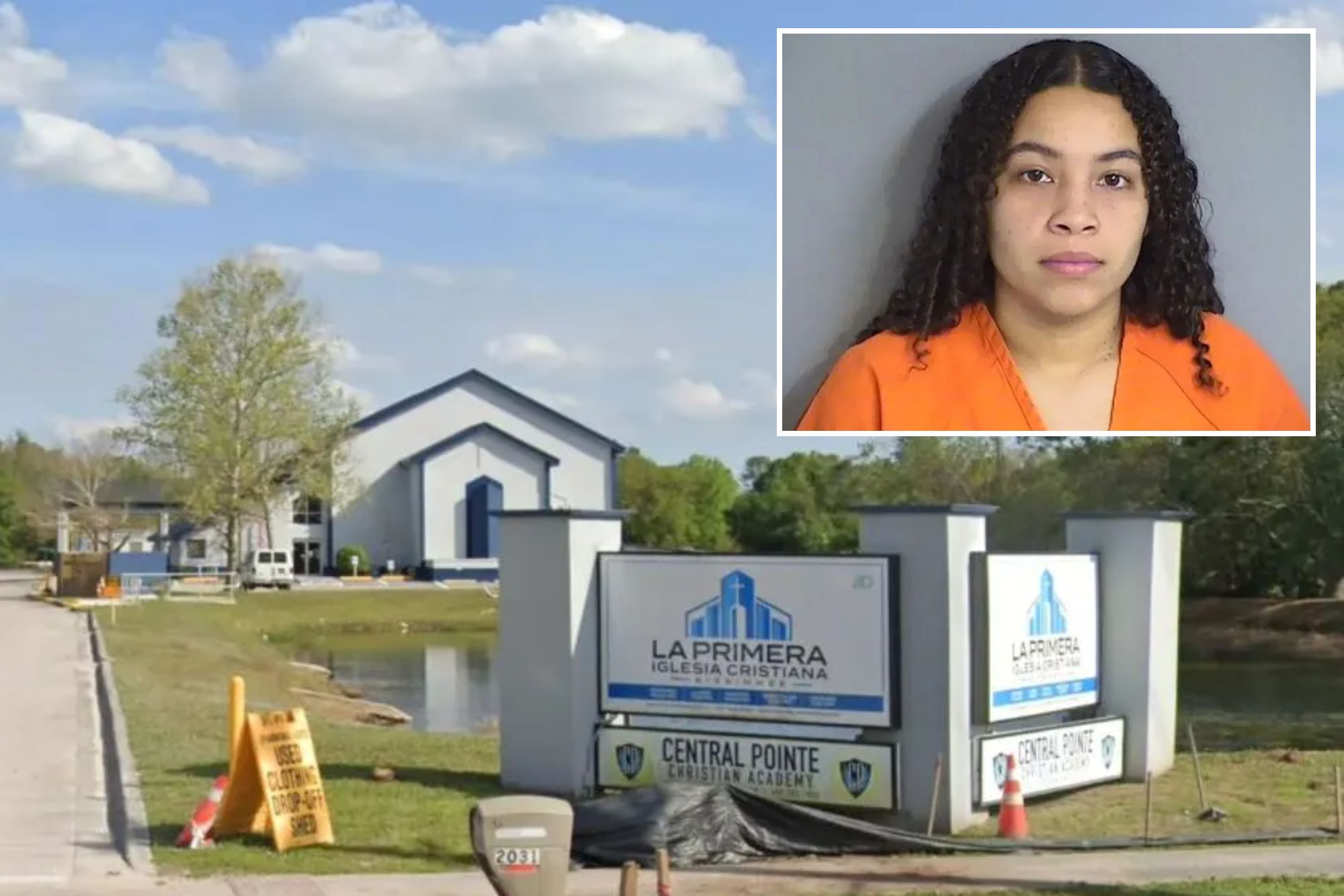 Un collage de imágenes que contiene 2 imágenes. La imagen 1 muestra el letrero de Central Pointe Christian Academy frente a un edificio junto a un estanque. La imagen 2 muestra una fotografía policial de Yezmar Angeanis Ramos-Figueroa.