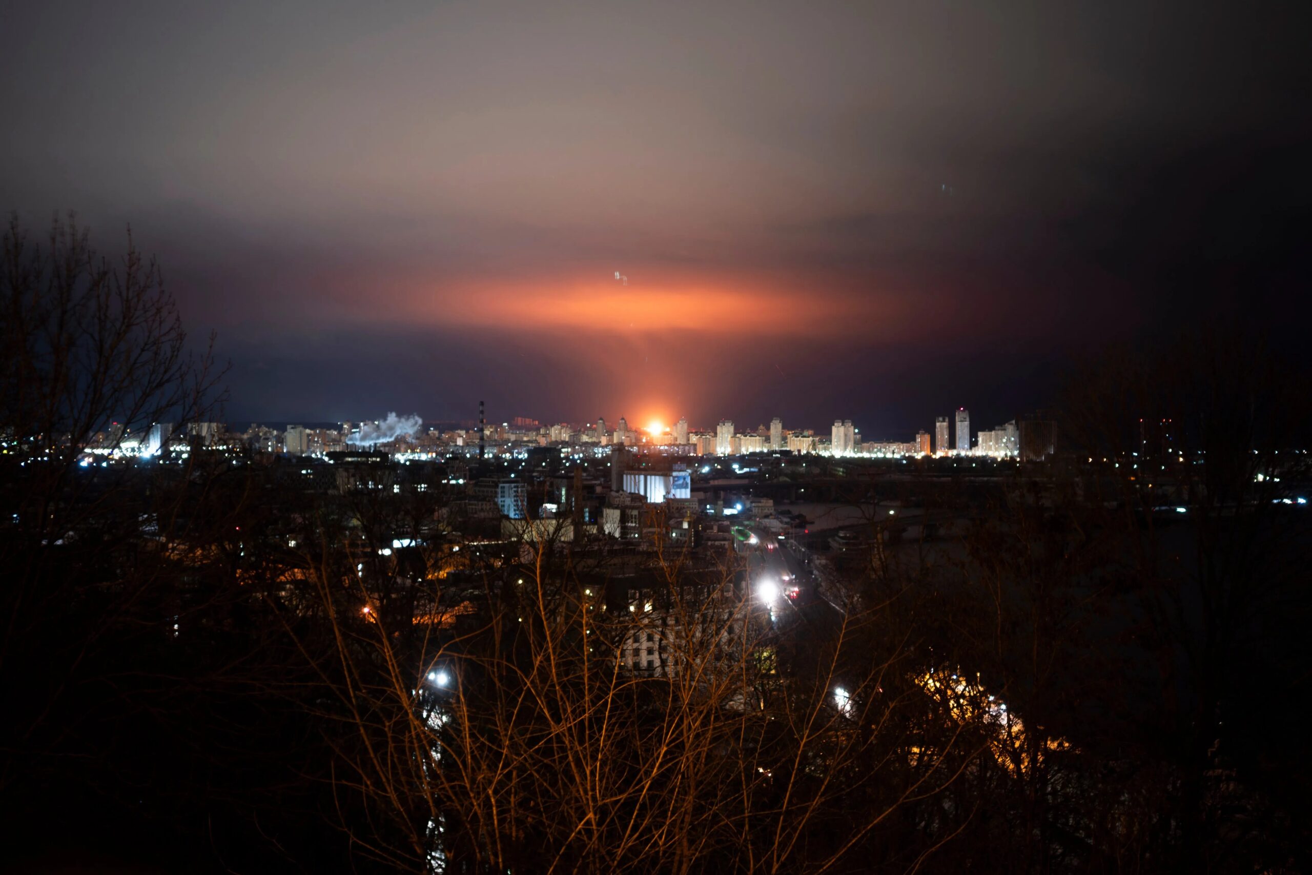 Una alerta aérea duró varias horas después de que fuertes explosiones nocturnas acompañadas de destellos brillantes tiñeran el cielo de color naranja.