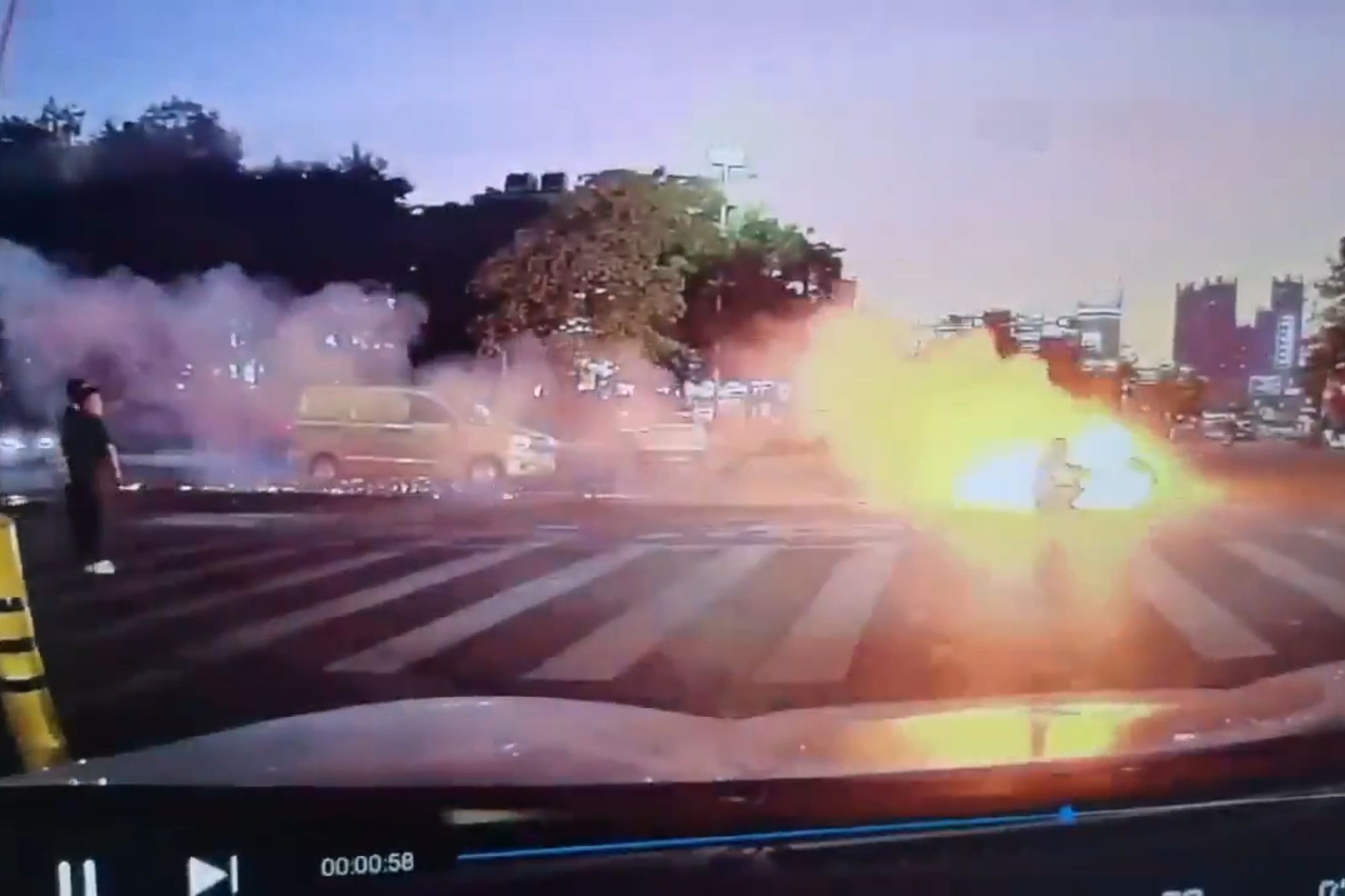 La moto estalló en llamas y humo negro se elevó del lugar.Crédito: x.com/byron_wan