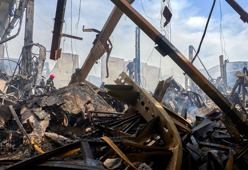 Ukrainian firefighters and rescuers work at the site of a damaged storage facility of a private factory near KharkivCredit: EPA