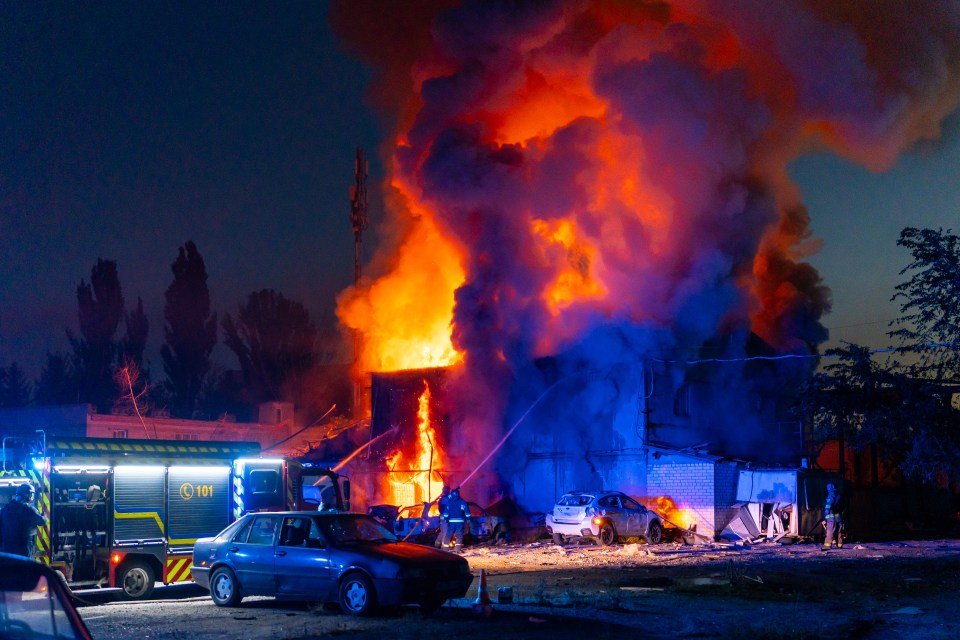 Los bomberos que trabajan para apagar un incendio masivo en un edificio en Zaporizhzhia, Ucrania.